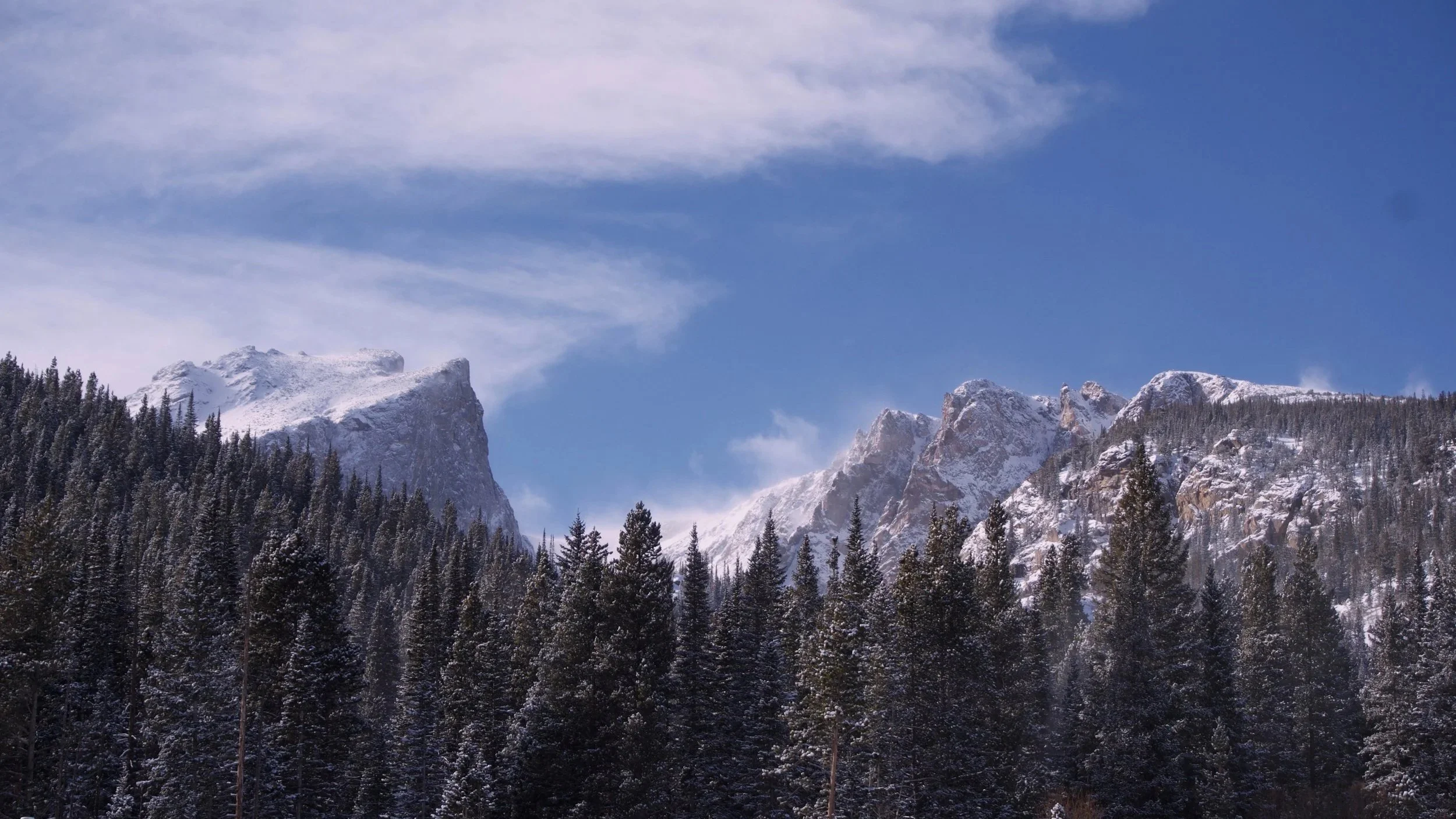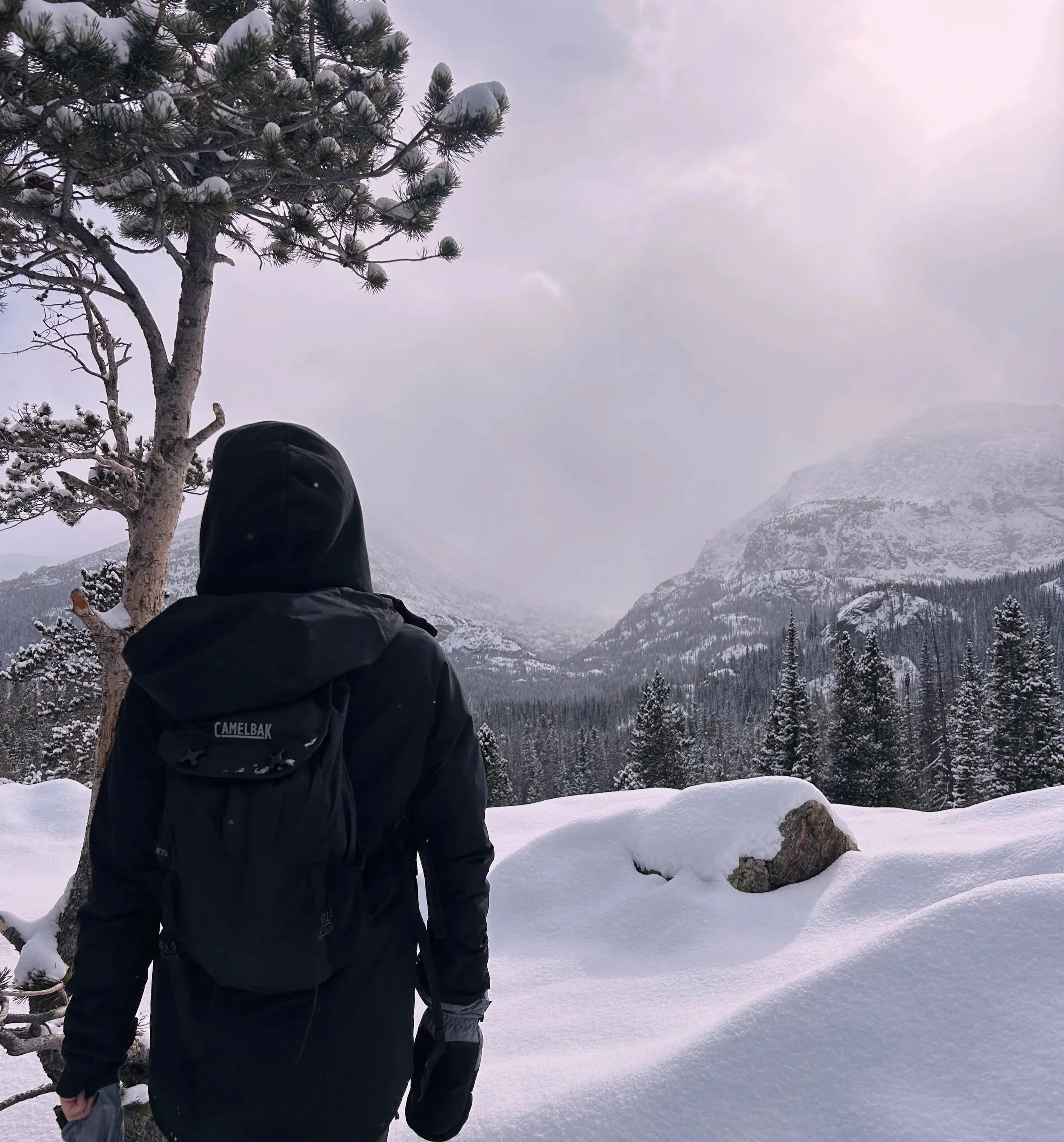We reached Dream Lake, though it hardly looked like a lake - just a smooth layer of snow and ice. You wouldn’t even know there was water beneath it. As we sat there, I noticed the mountains rising behind the trees and grabbed my camera. The scene didn’t look real: clouds casting shadows across the peaks, snow settling over everything, and the contrast of dark green trees against white terrain making it feel almost unreal.